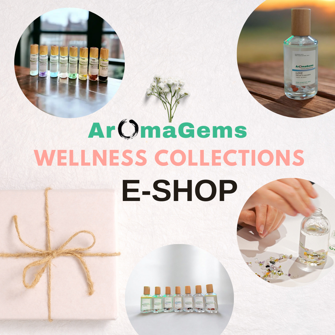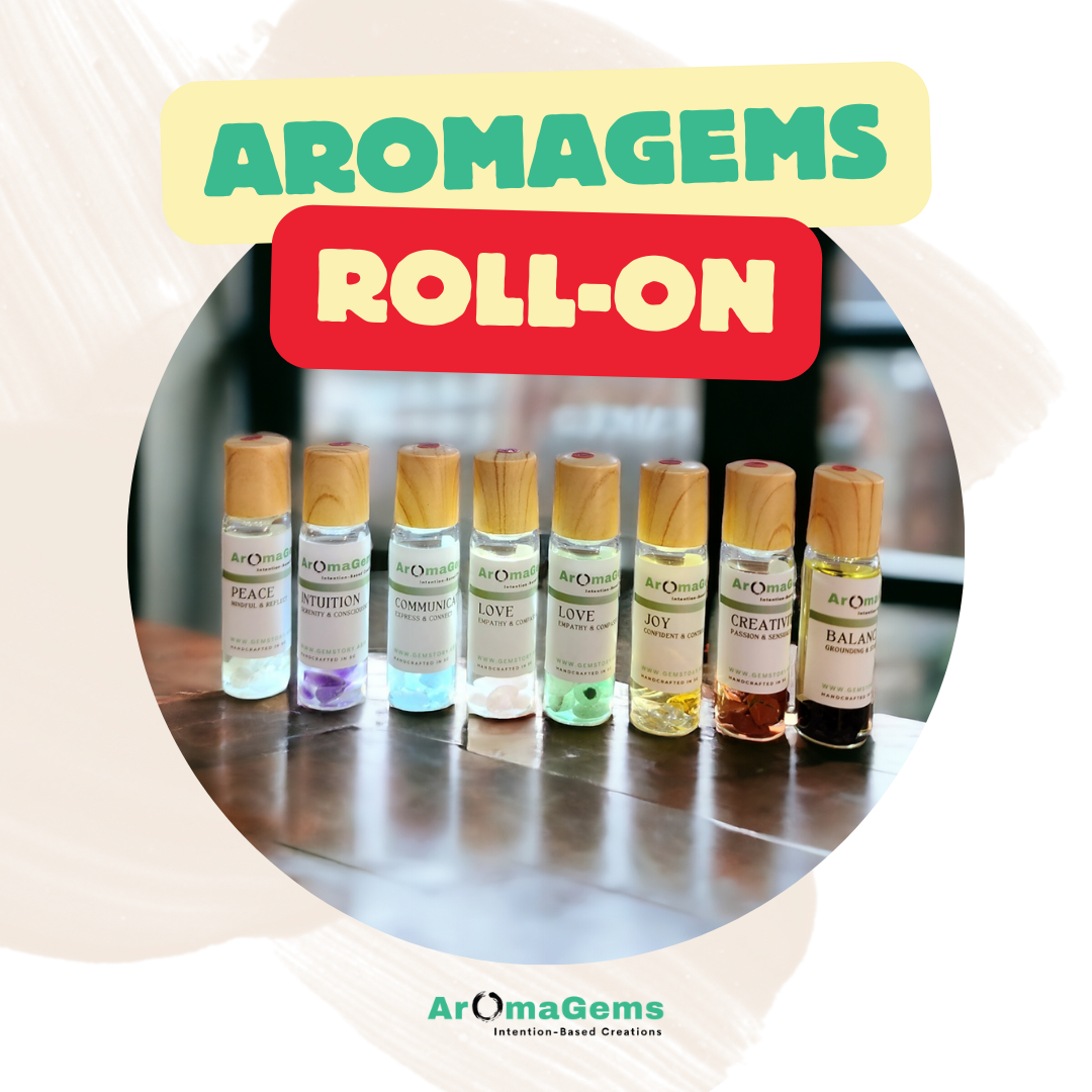 The Aromagems Collection is a series of handcrafted blends combining pure essential oils with crystal energy, designed to support emotional balance, mental clarity, and overall well-being. Available in Mist, Roll-On, and Diffuser Blend formats.